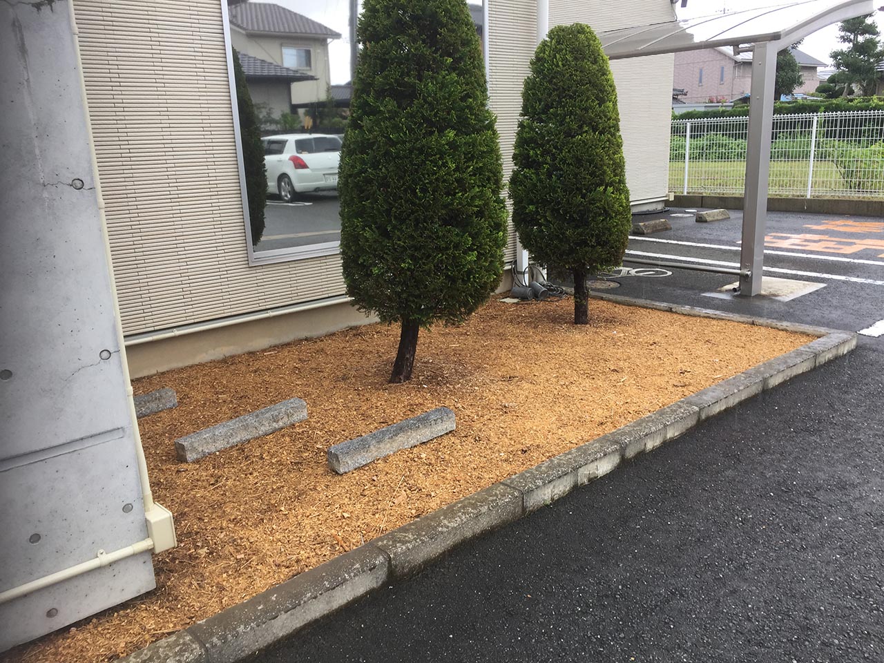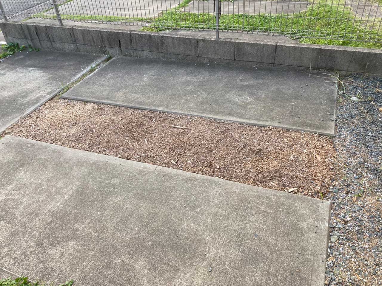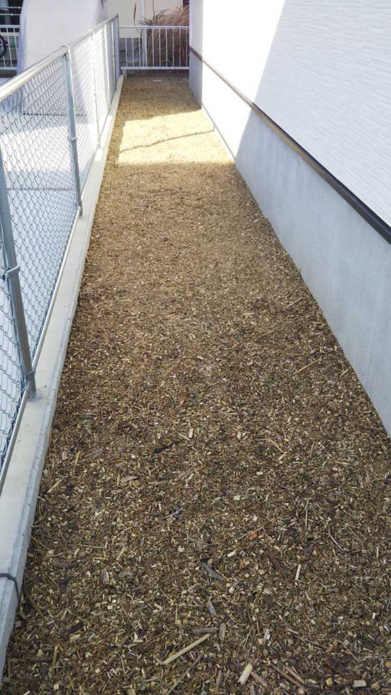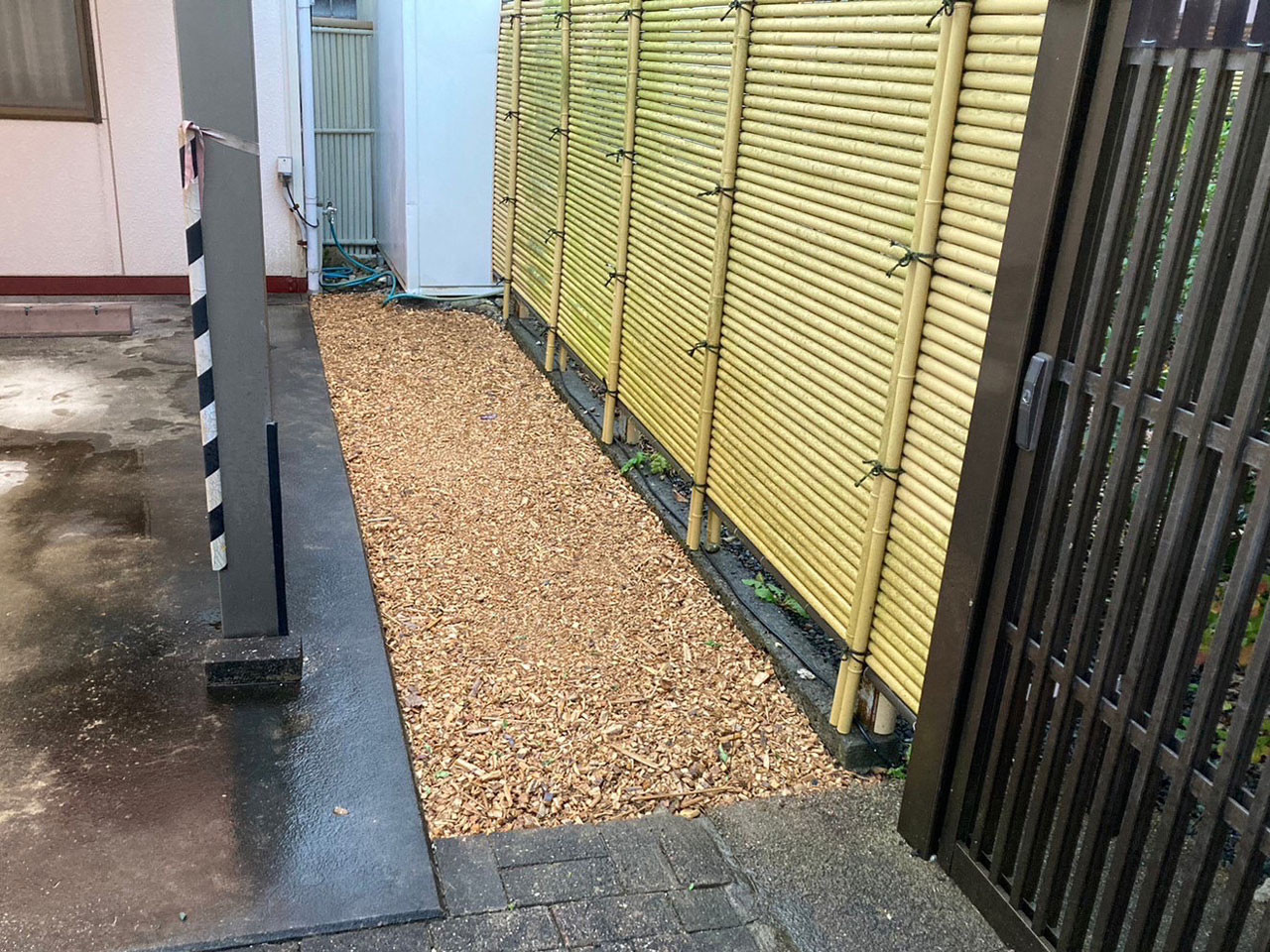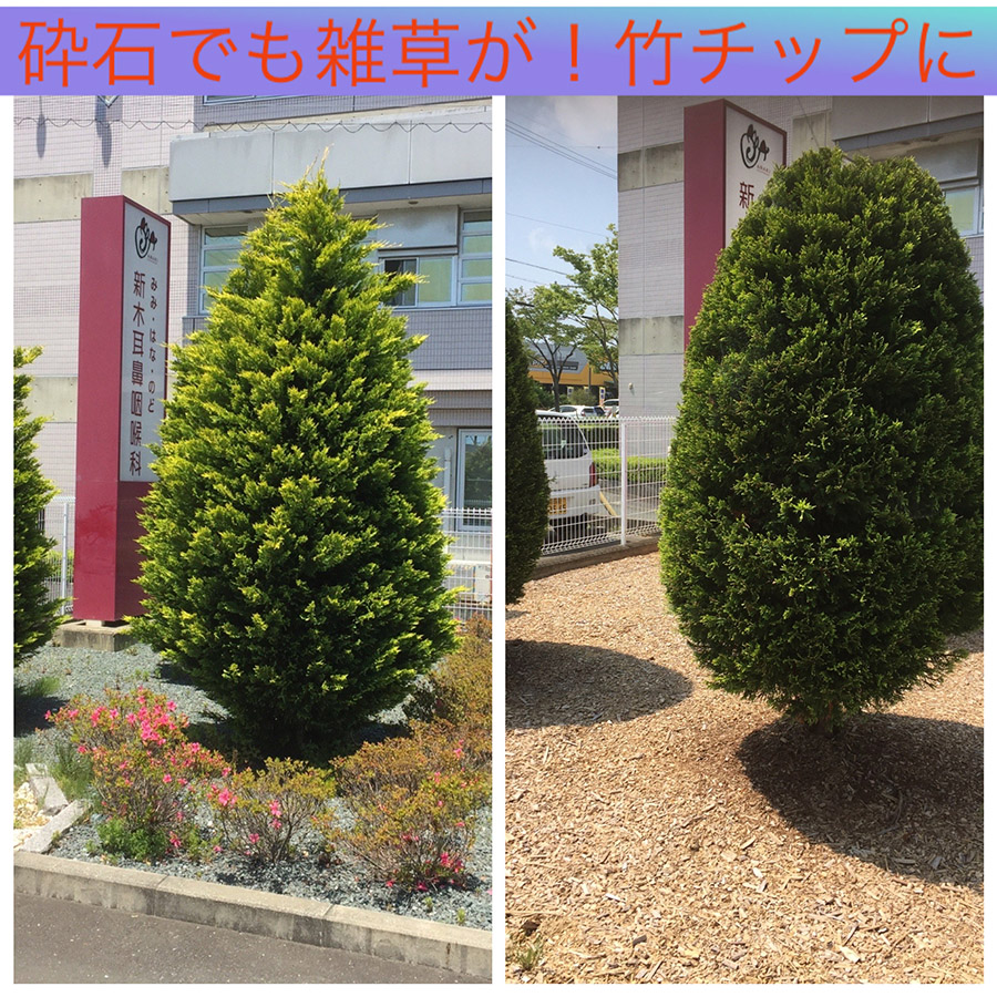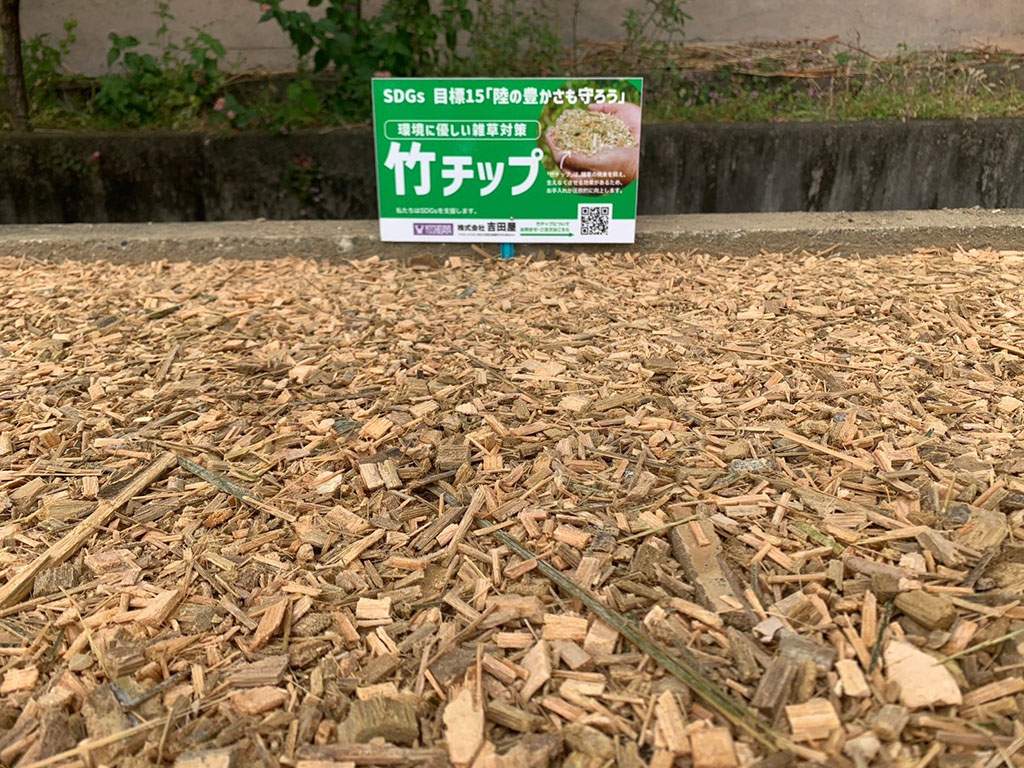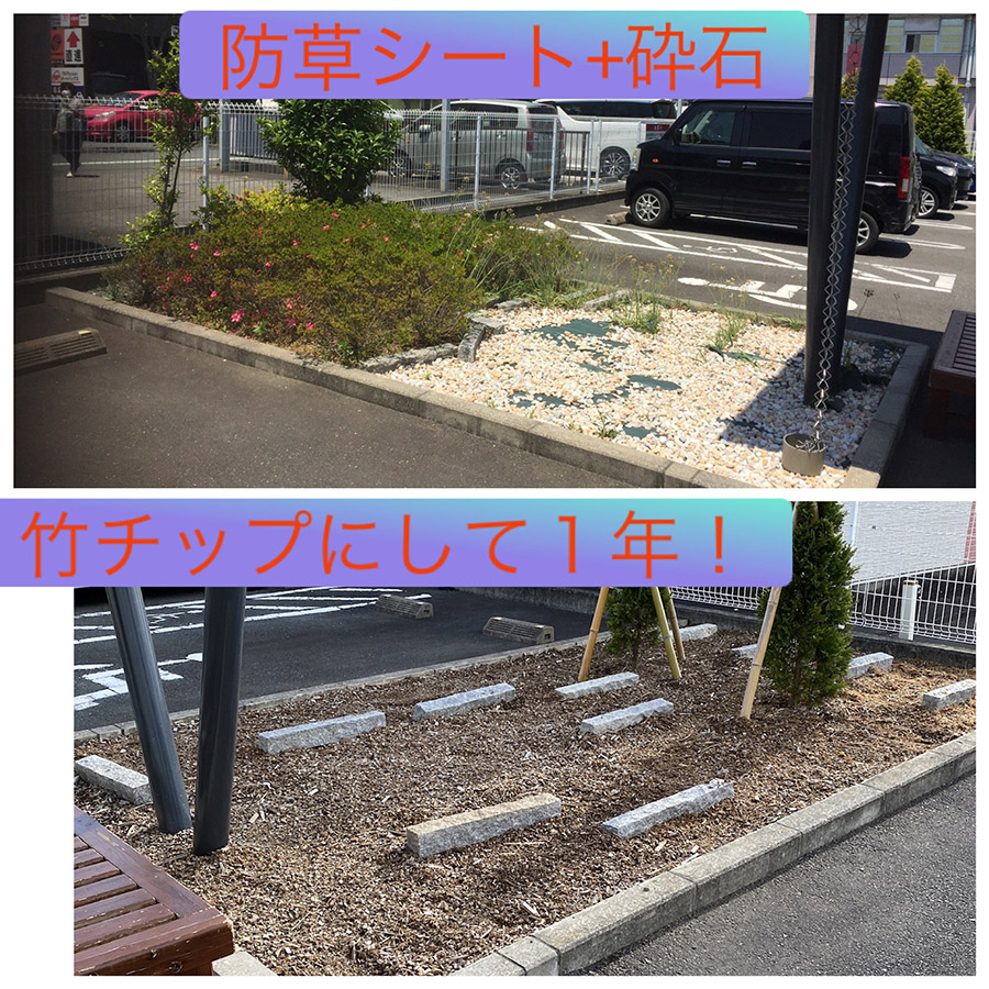 その様なときに吉田屋さんから“竹チップ”をご紹介頂きましたが最初は半信半疑でした。 とりあえずという感じで設置して頂きました。 驚くことに効果は絶大で雑草除去作業は無くなってしまいました。 施工当初は“竹チップ”が風で舞ってしまうのではないかと心配しましたがまったく舞いません。 竹を粉砕したものなので環境にも優しく今の時代にマッチした雑草対策だと思います。