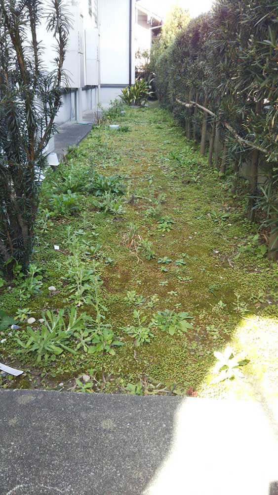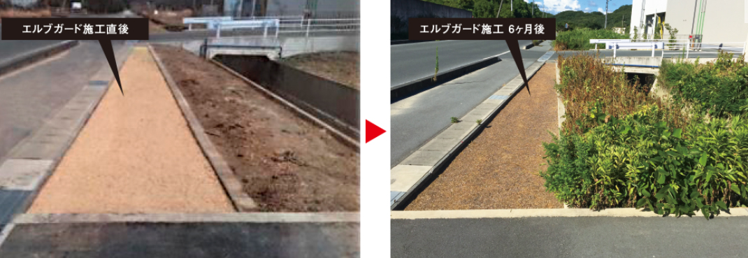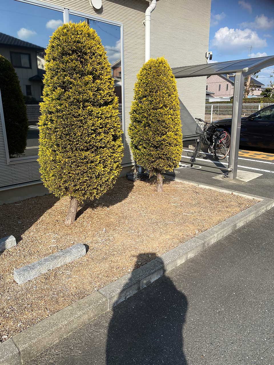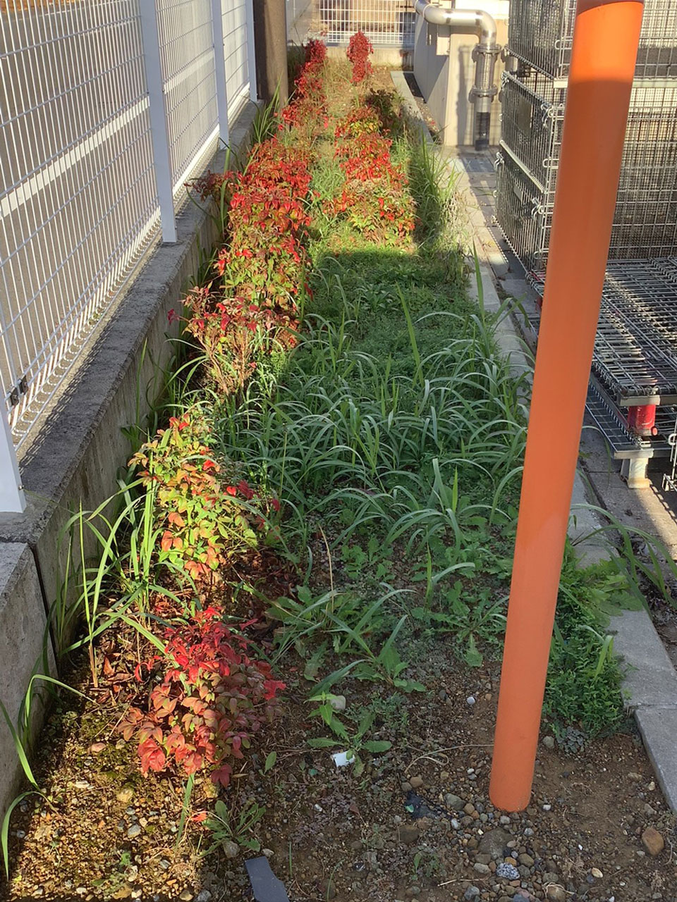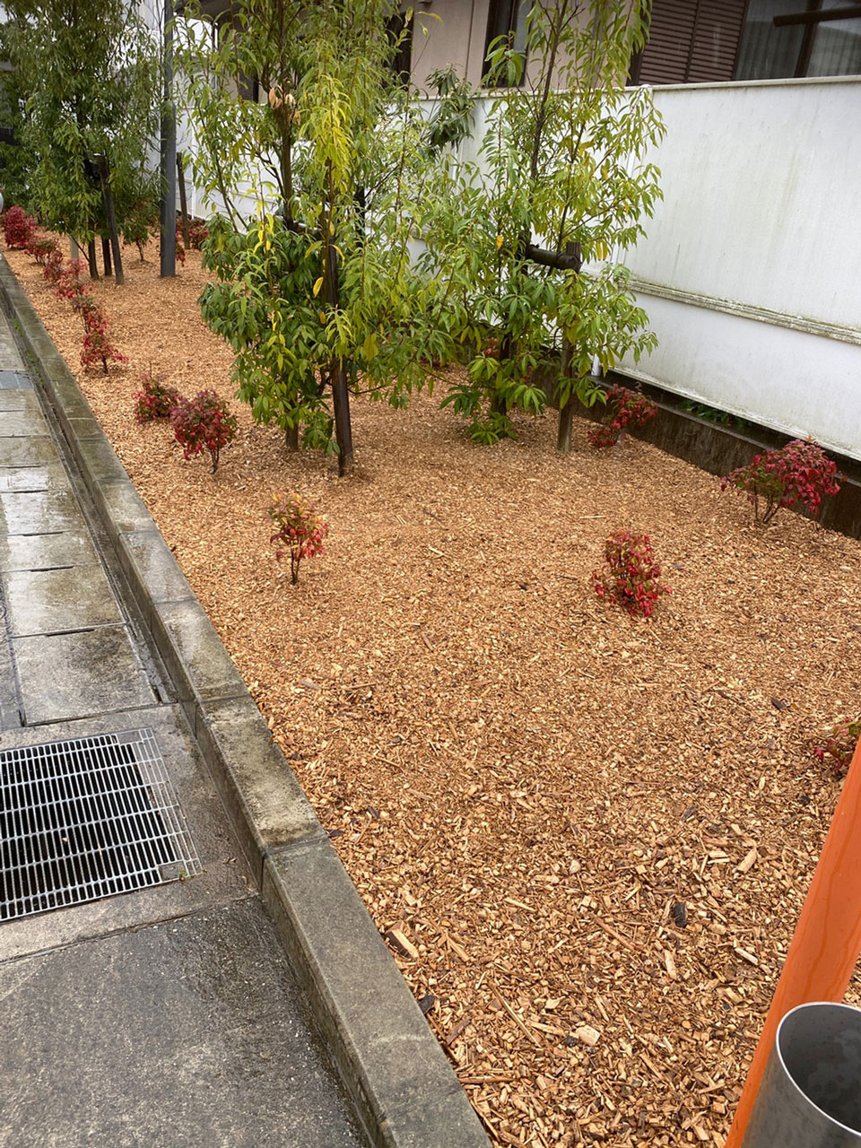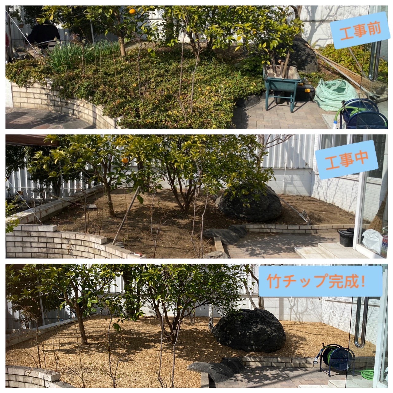 その様なときに吉田屋さんから“竹チップ”をご紹介頂きましたが最初は半信半疑でした。 とりあえずという感じで設置して頂きました。 驚くことに効果は絶大で雑草除去作業は無くなってしまいました。 施工当初は“竹チップ”が風で舞ってしまうのではないかと心配しましたがまったく舞いません。 竹を粉砕したものなので環境にも優しく今の時代にマッチした雑草対策だと思います。