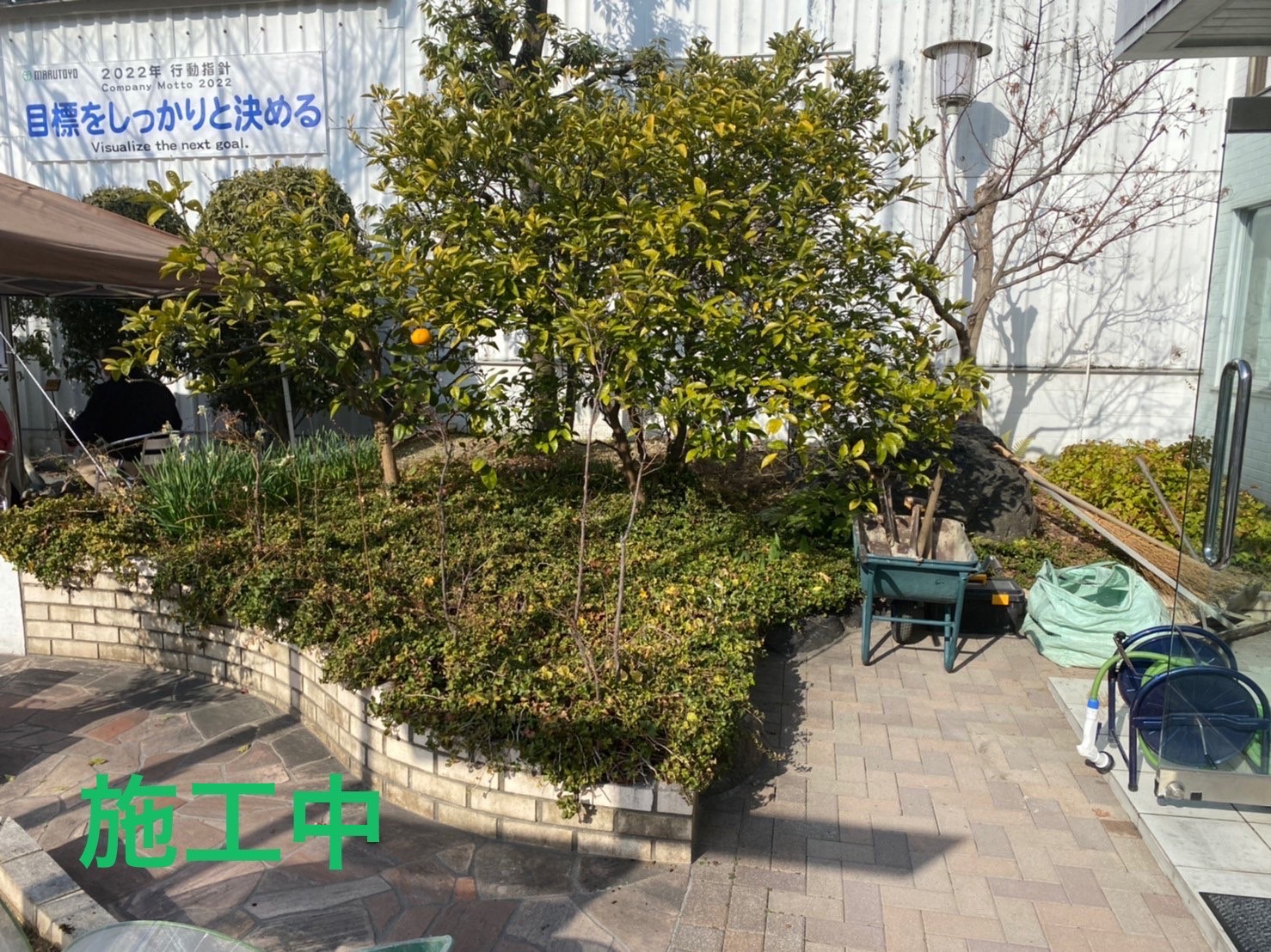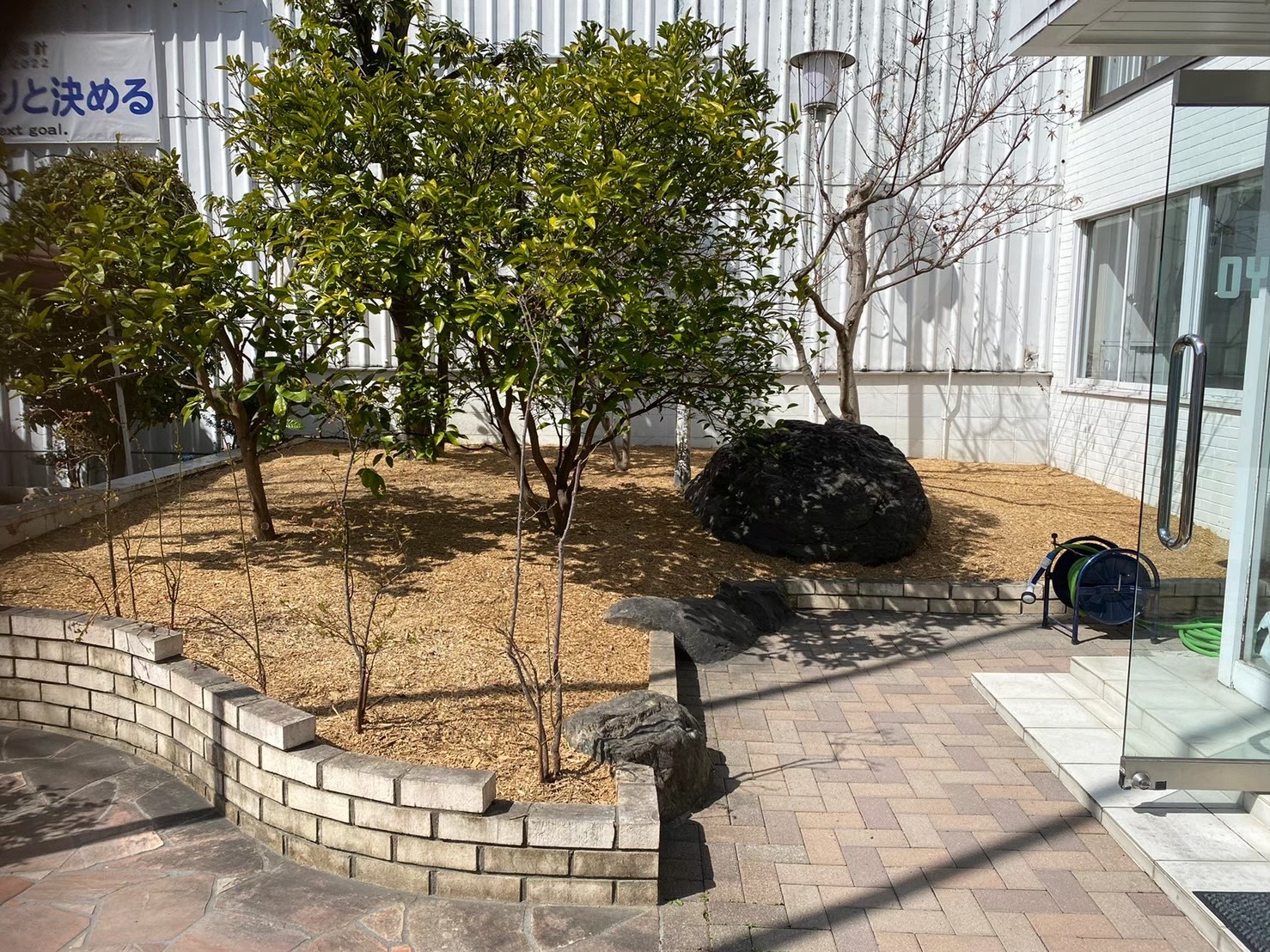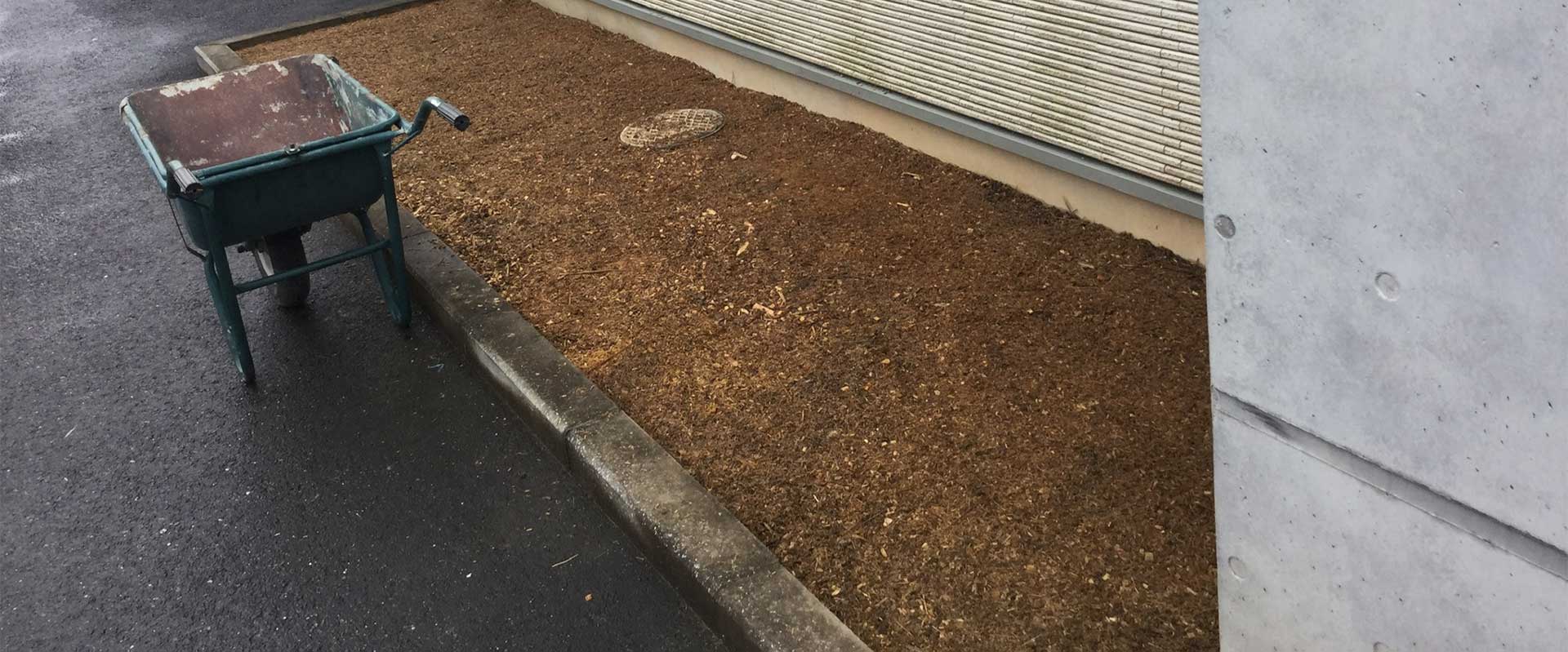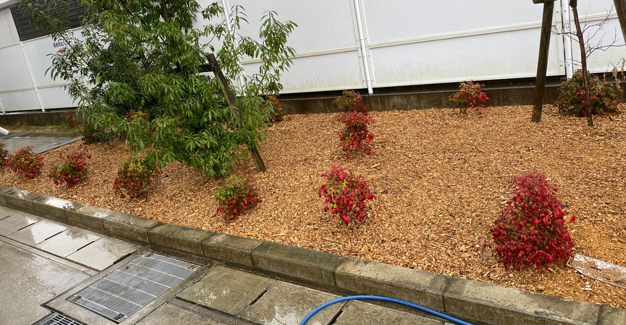 雑草に大変苦労されており、雑草除去にかなりのコストを掛けておられたので、今回竹チップを提案させて頂きました。ここの工場は緑地規制があり、そこの辺りを気にされておりましたが、 竹チップを敷き詰めても植栽をところどころ植えてあれば問題ない事を説明させて頂き進めさせて頂きました。