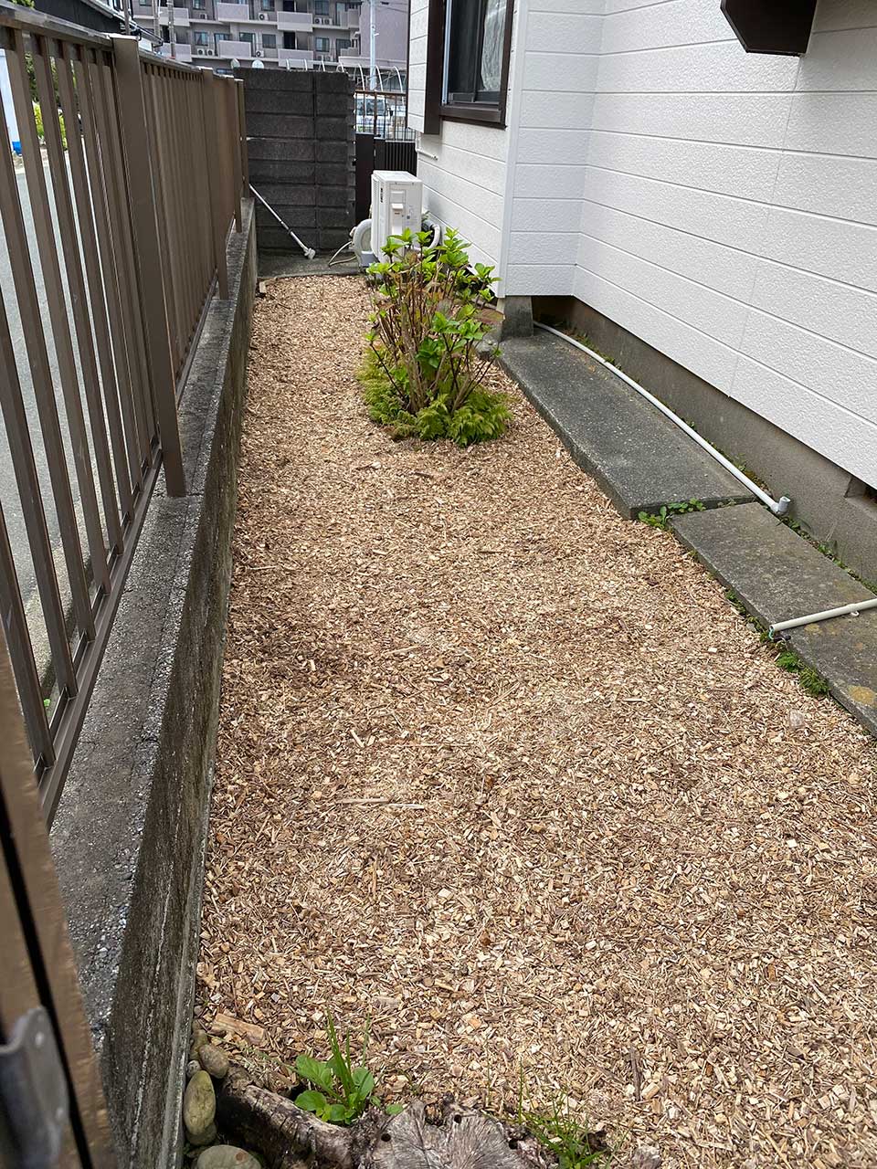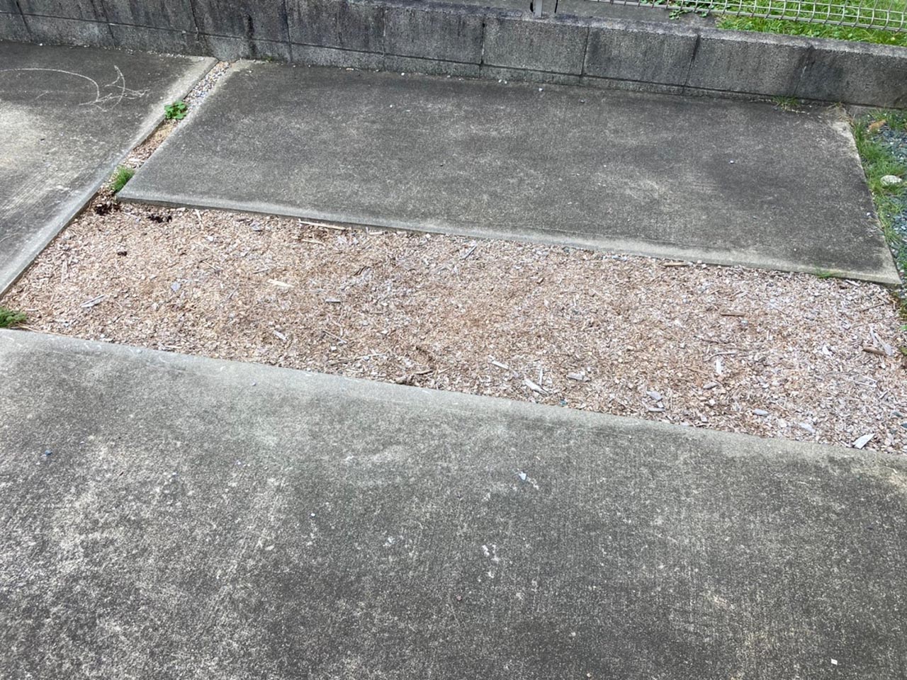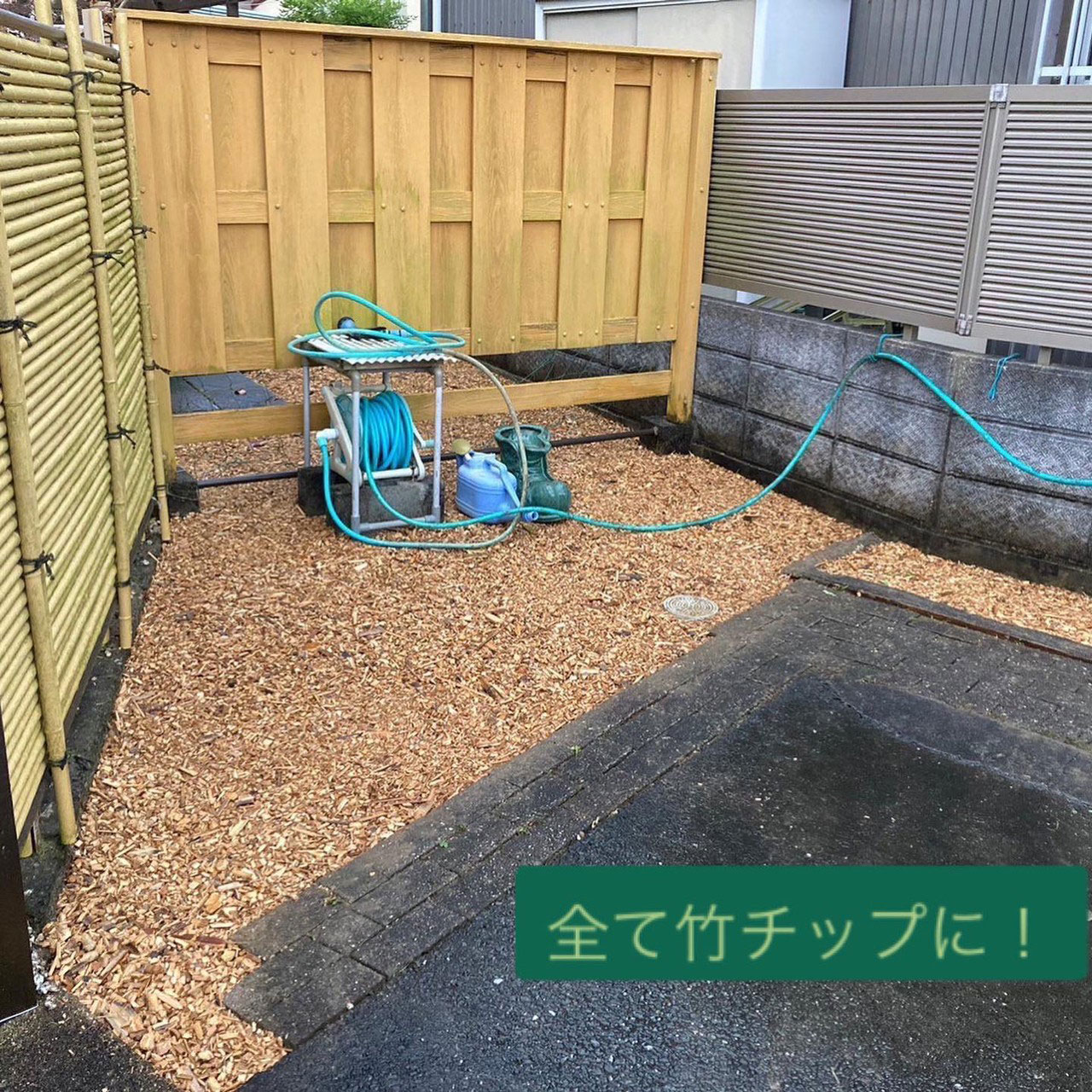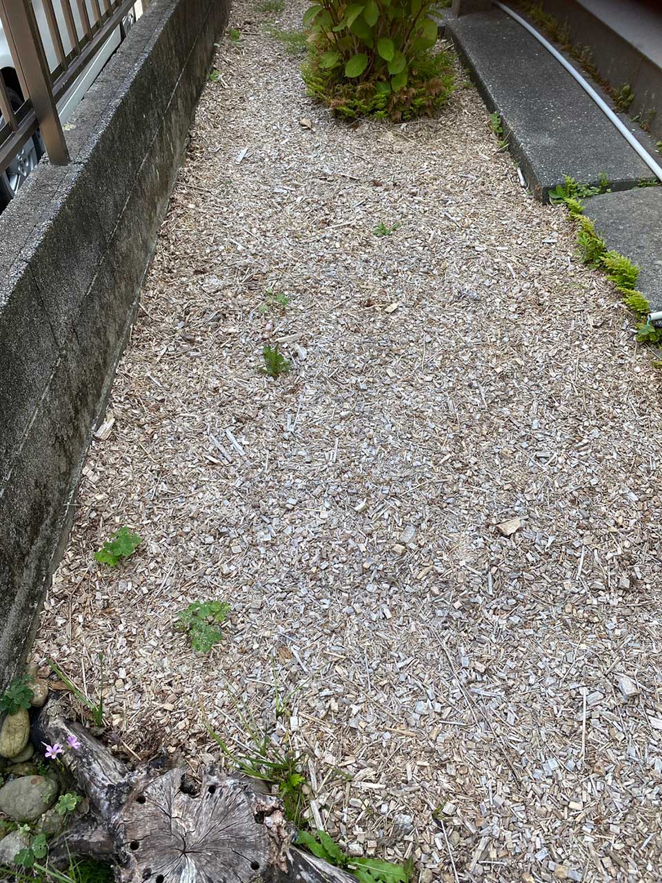 こちらは、雑草対策で今まで防草シート+白砂利 をやってましたが、防草シートから雑草が生えてしまい今回 竹チップに!
