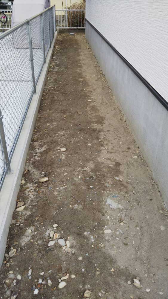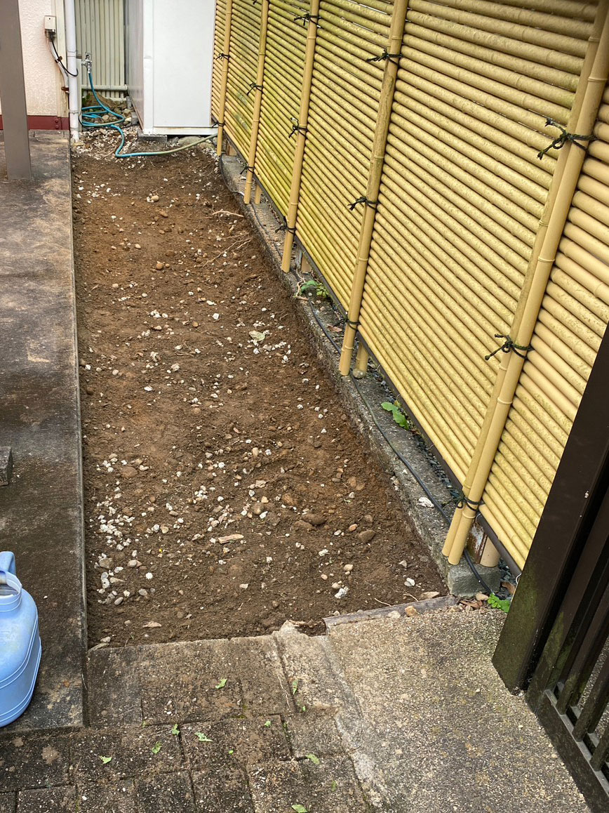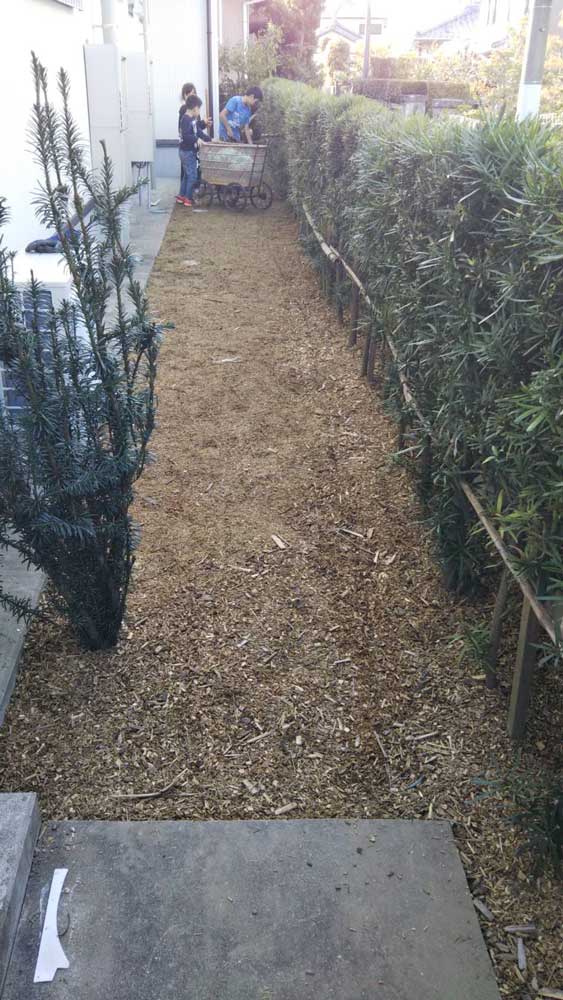 このように、土を掘り起こし、雑草を根から取り除いてから、竹チップを敷き詰めてください。 後は、最後に簡単に、足で踏んで頂ければOKです!
