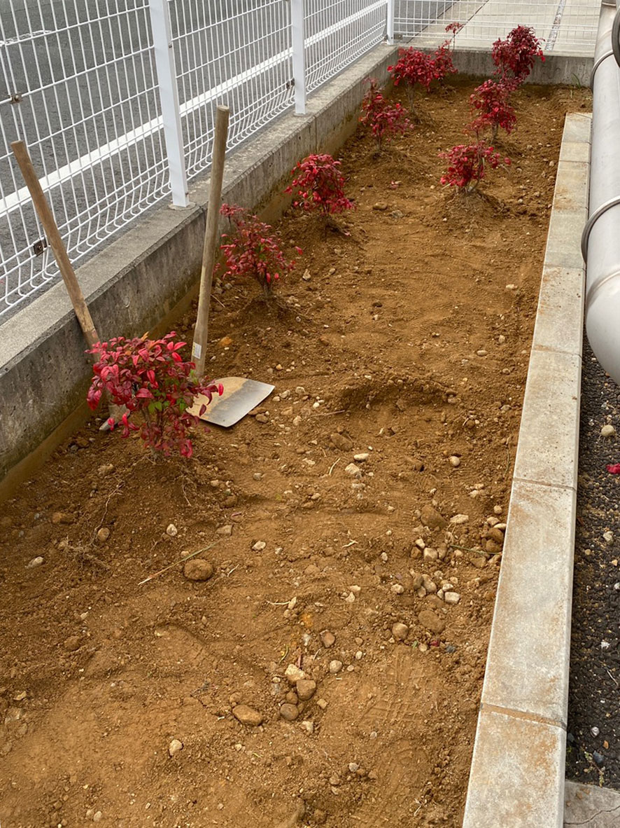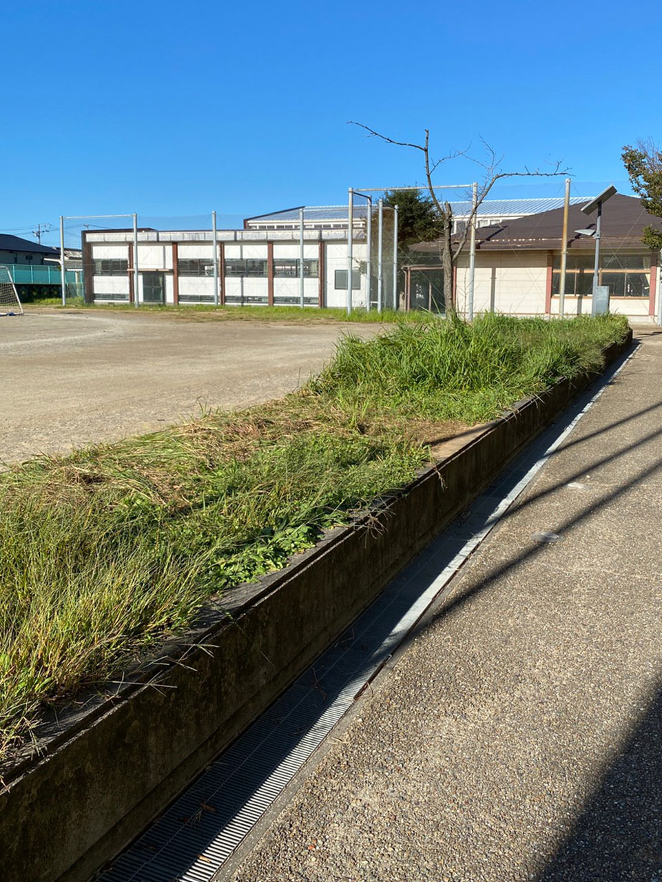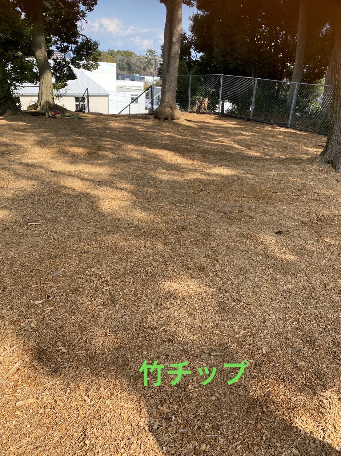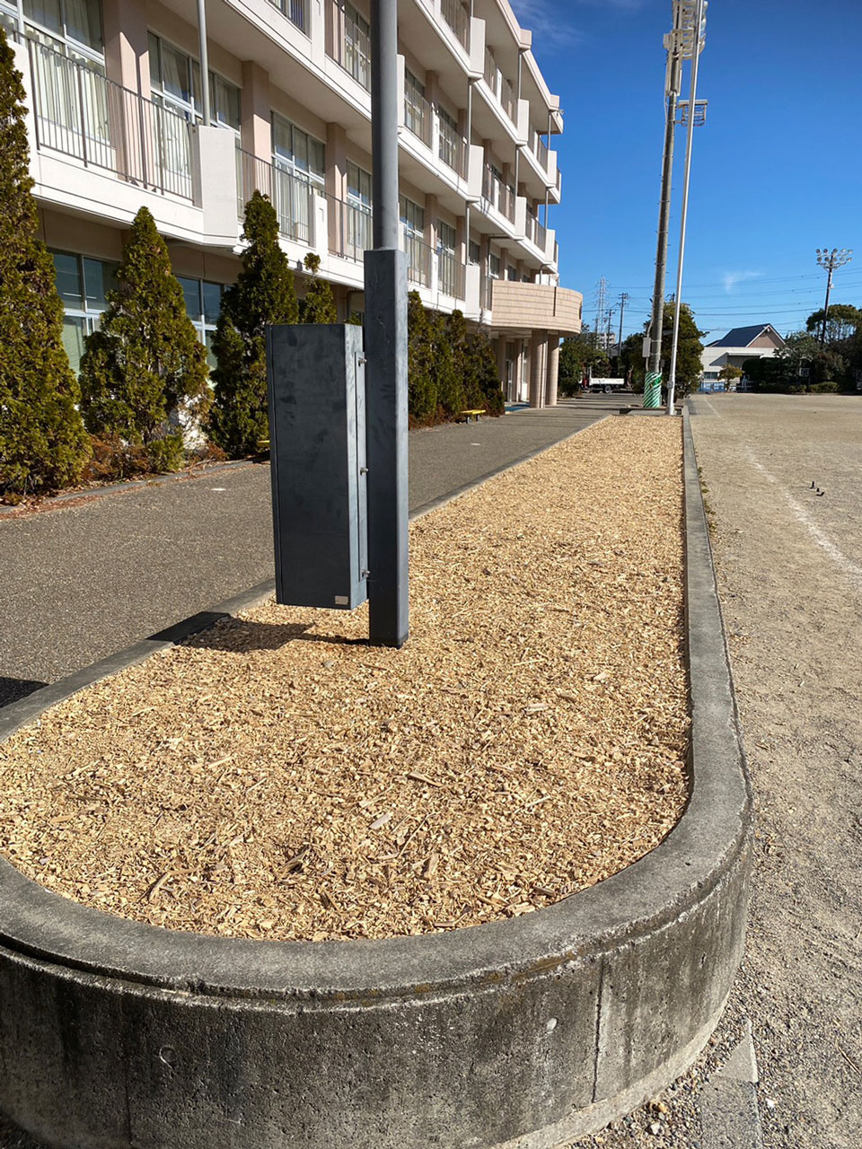 毎年、校庭の雑草に悩んでおり、1ヶ所を 雑草対策の竹チップでテストをし 実際に雑草が生えてこない実績を見て頂き、全てのスペースに”竹チップ”を敷き詰めて頂きました。